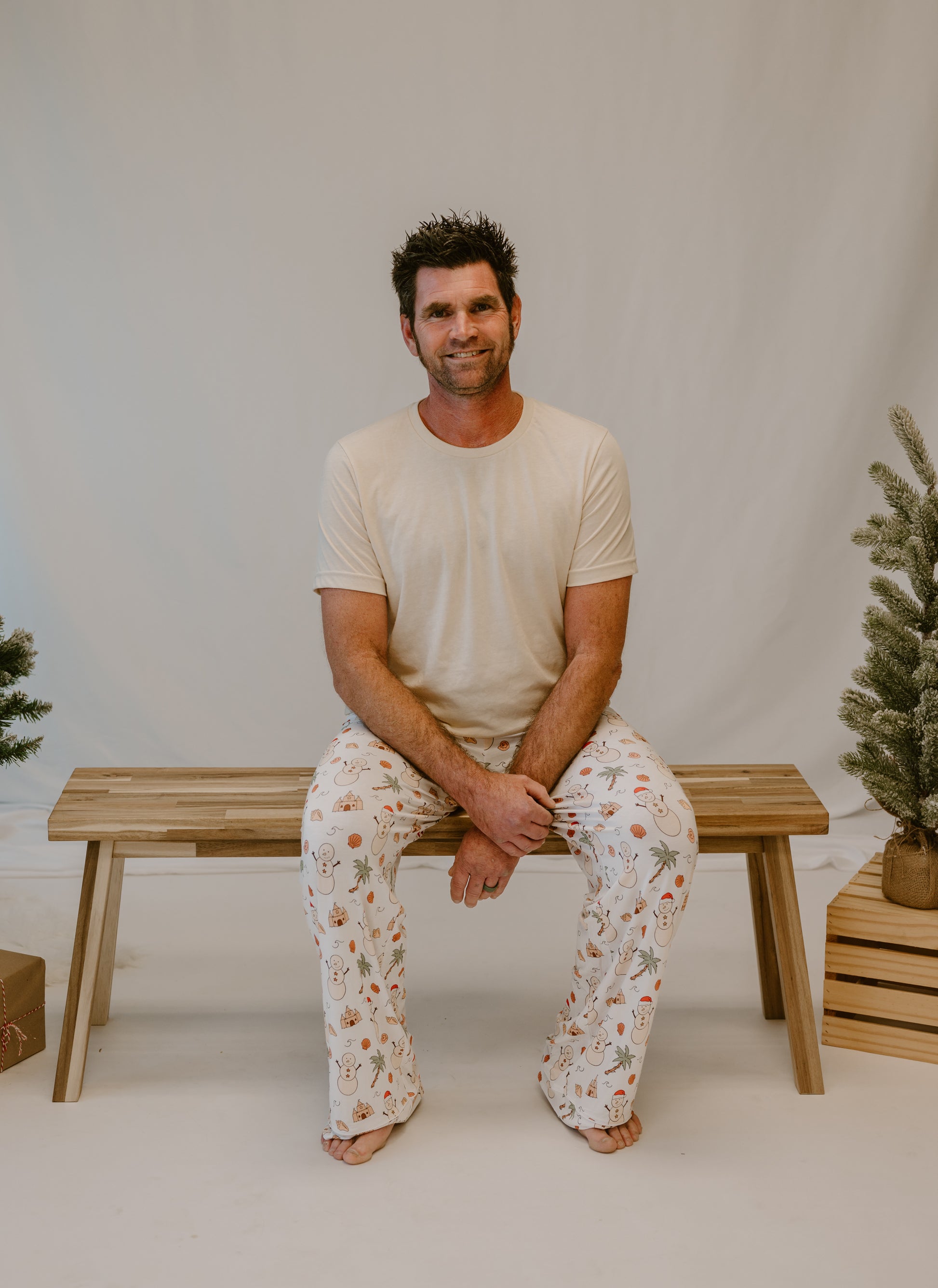 Bring some Florida sunshine to your Christmas morning with our Men’s Jingle Bells and Sea Shells Pajamas. Featuring the same cheerful coastal print as the rest of the collection — with sand-and-shell snowmen, palm trees wrapped in lights, and festive waves — these pajamas are perfect for matching family moments filled with laughter and light.
